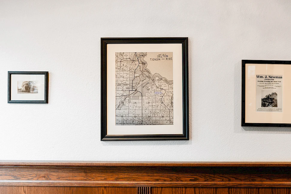 The large Delton Township map from 1936, located here and in the lower-level hallway near the staircase, commemorates the grand plan of William J. Newman to develop the 2000 acre “Dawn Manor Resort” stretching from Lake Delton, built by Newman and excavator Ralph Hines, to the current location of the mansion here on Mirror Lake.